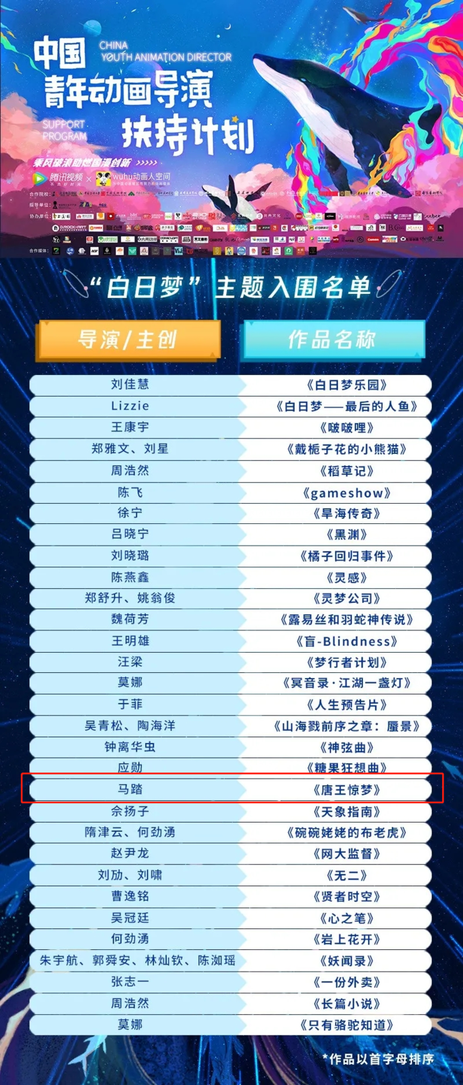 日前,2021年中国青年动画导演扶持计划入围作品名单揭晓,映和动画团队积极响应,角逐“白日梦”主题赛道。经过数个月的等待,映和动画《唐王惊梦》从1000+部作品中脱颖而出,成功上榜。这对刚起步的原创动画公司而言,无疑是一个振奋人心的消息,在此我们特别感谢主办方与评委的厚爱。
