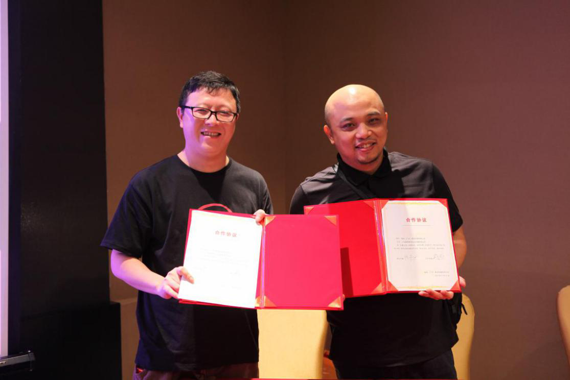 致辞过后,吴昶宏先生代表广州麦斯影视文化传播有限公司出席签约仪式,映和影视董事长陈和乐共同出席,双方签订协议并握手。